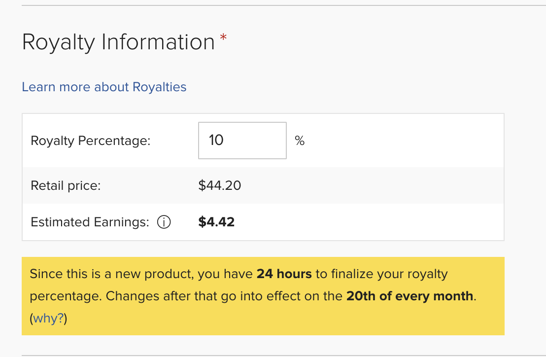 Set your royalty percentage (Adjustable from 5% to 50% for physical products and 5% to 99% for digital products.).